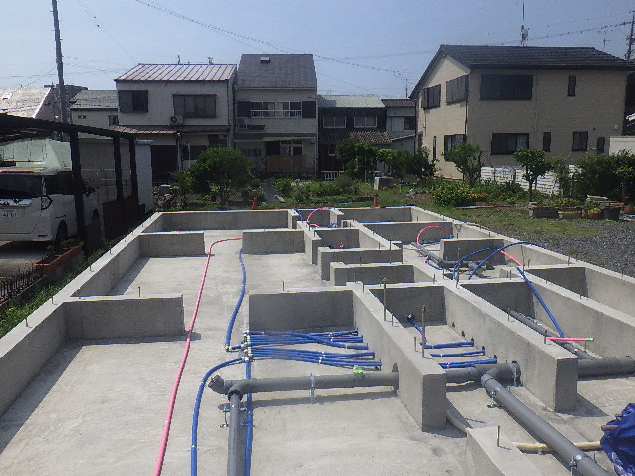 写真は基礎の立ち上がり部分が完成し、配管を設置した段階です。